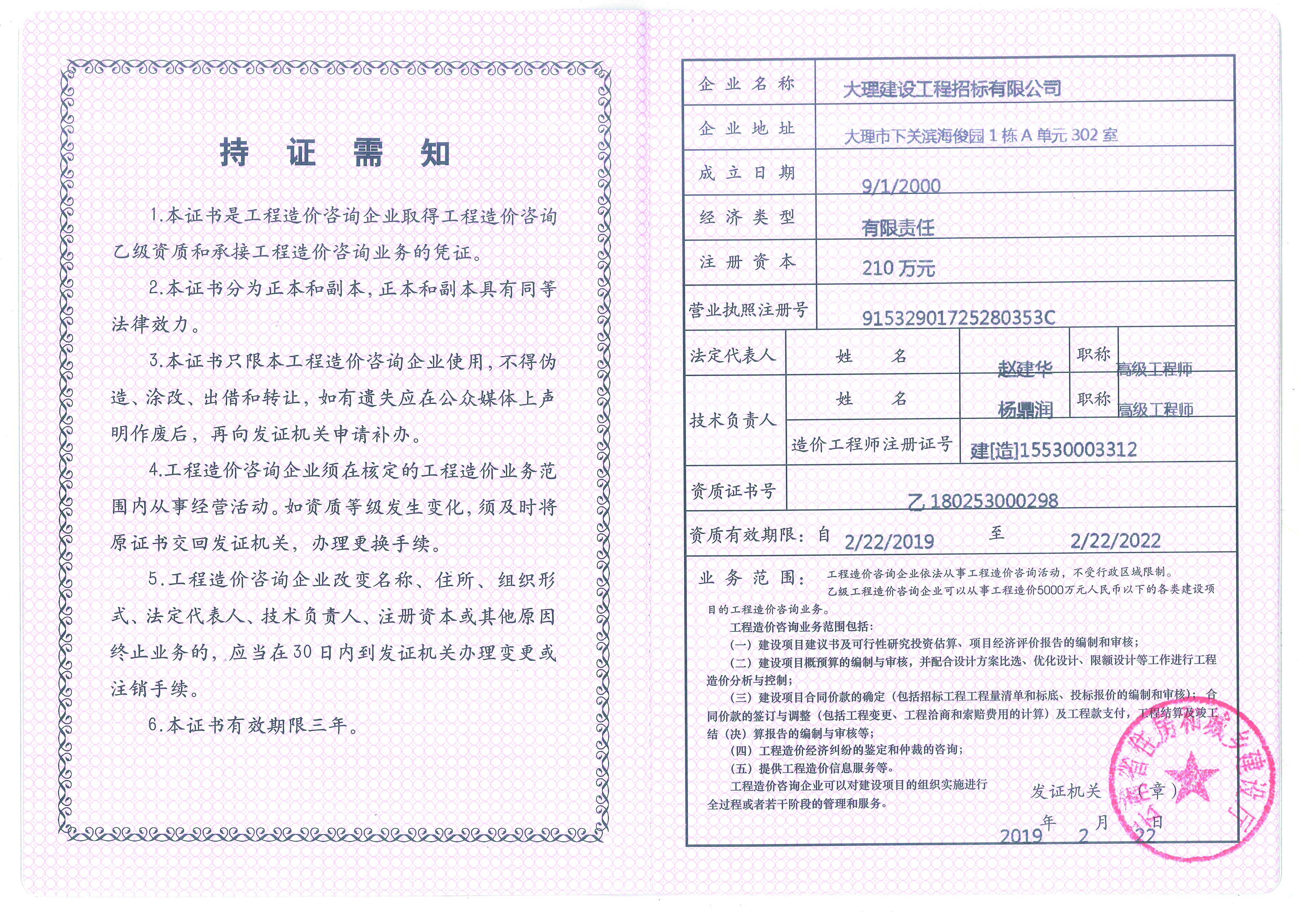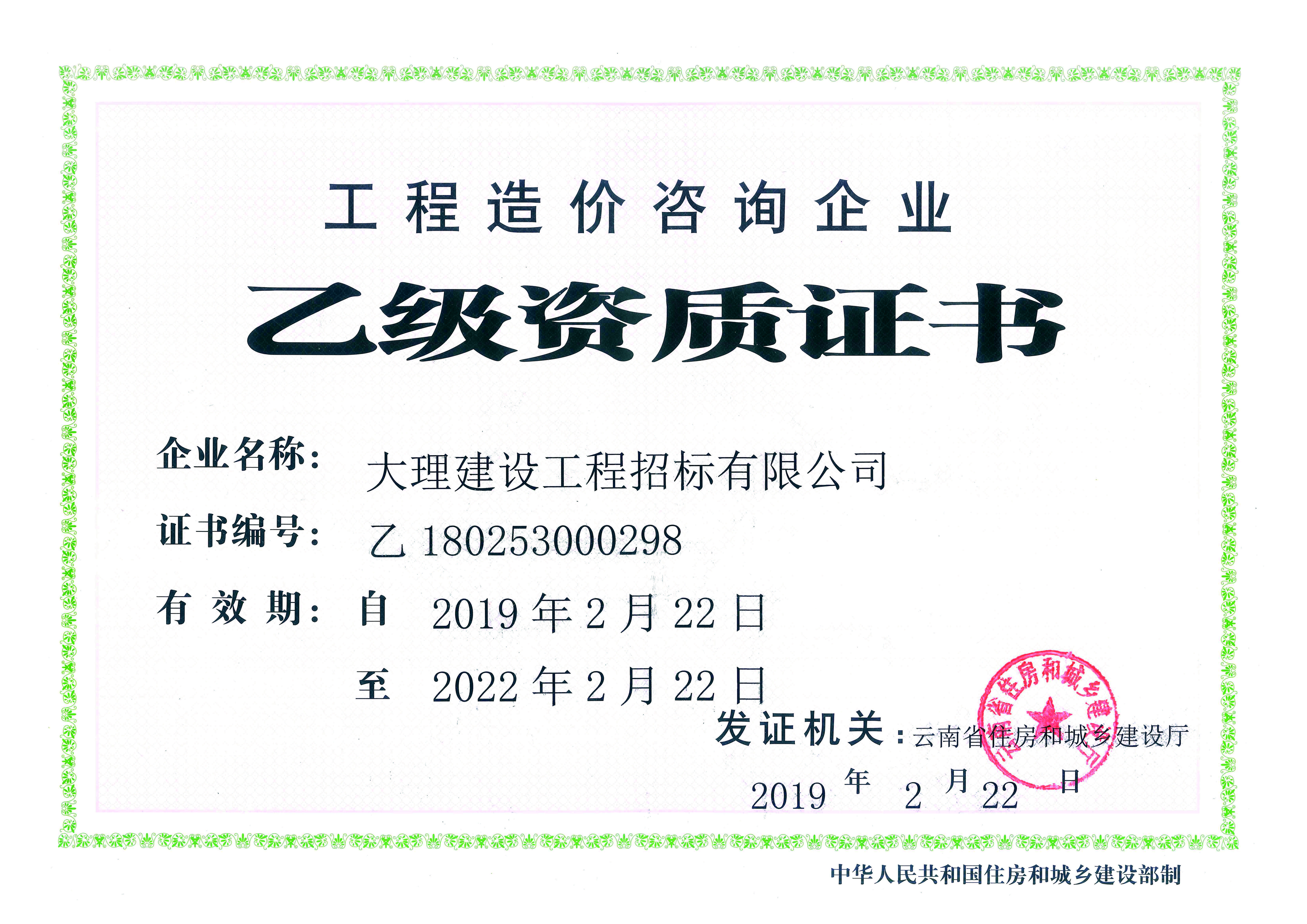 工程造價咨詢企業(yè) 乙級資質(zhì)證書