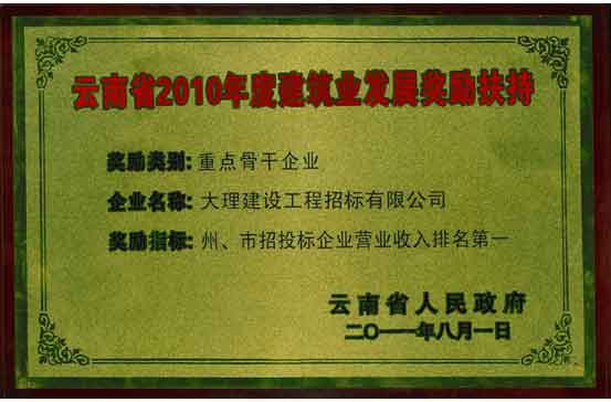 云南省2010年度建筑行業(yè)發(fā)展獎(jiǎng)勵(lì)扶持
