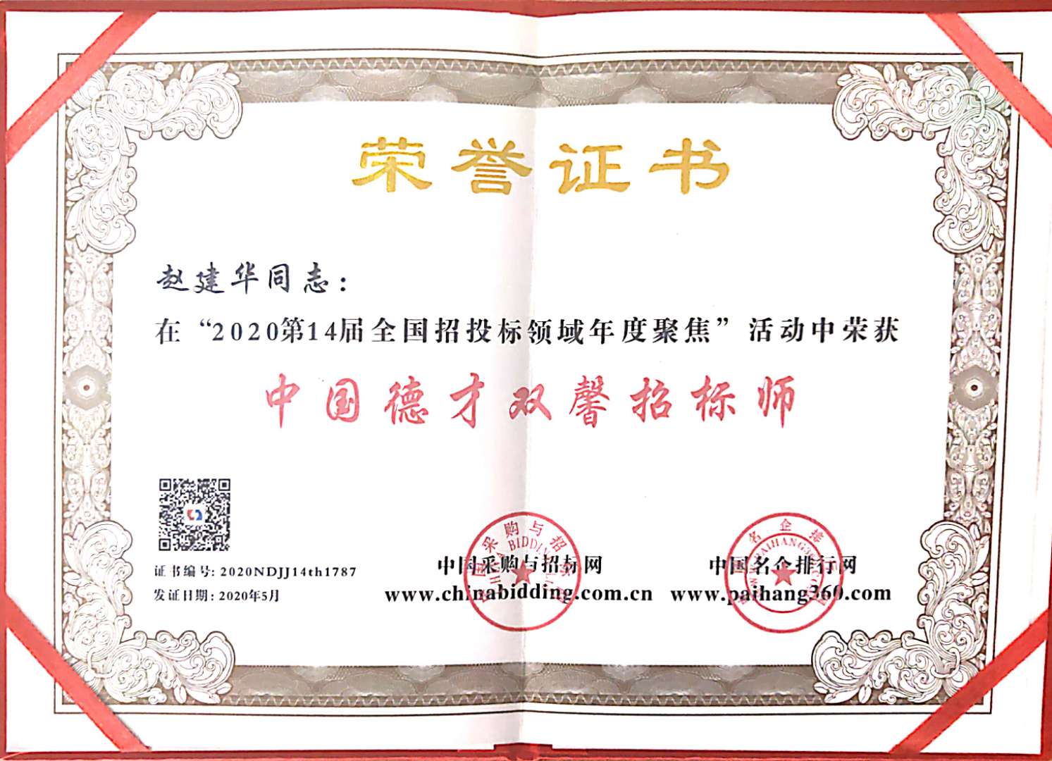 趙建華同志榮獲中國德才雙馨招標師